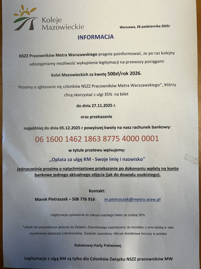 Zarząd Regionu Mazowsze NSZZ „Solidarność” zaświadcza, że Organizacja Zakładowa NSZZ „Solidarność” Region Mazowsze w Metro Warszawskie Sp. z o.o., ul. Wilczy Dół 5, 02-798 Warszawa jest zarejestrowana w Rejestrze Podstawowych Jednostek Organizacyjnych Związku Regionu Mazowsze pod numerem 732.
